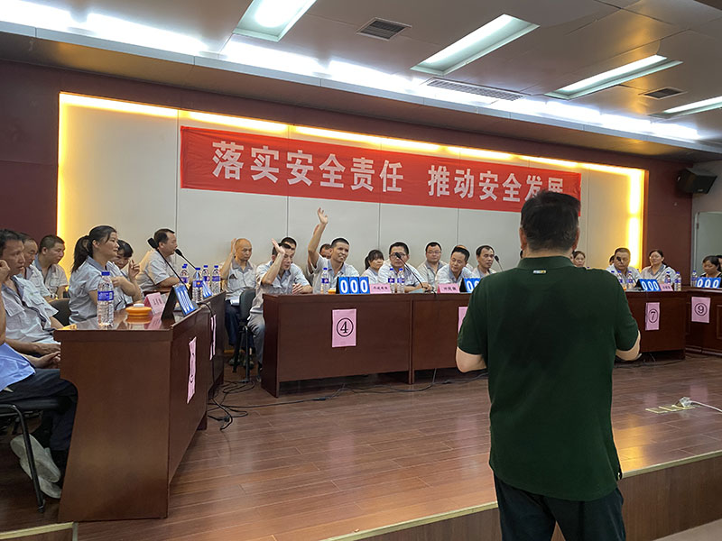 本次競賽邀請了漳平市應(yīng)急局、漳平市工業(yè)園區(qū)、漳平市蘆芝鎮(zhèn)政府等相關(guān)部門領(lǐng)導(dǎo)現(xiàn)場指導(dǎo),并做了重要講話和點(diǎn)評。公司內(nèi)共有10個(gè)代表隊(duì)參加,競賽以個(gè)人必答題、小組必答題、搶答題、風(fēng)險(xiǎn)題及現(xiàn)場觀眾互動(dòng)五種形式進(jìn)行,知識競賽現(xiàn)場氣氛熱烈、答題踴躍、各隊(duì)都是有備而來。經(jīng)過激烈的角逐,機(jī)關(guān)代表隊(duì)以總分第一獲得一等獎(jiǎng);四線、五線代表隊(duì)獲得二等獎(jiǎng);一線、倉儲、機(jī)電代表隊(duì)獲得三等獎(jiǎng)。